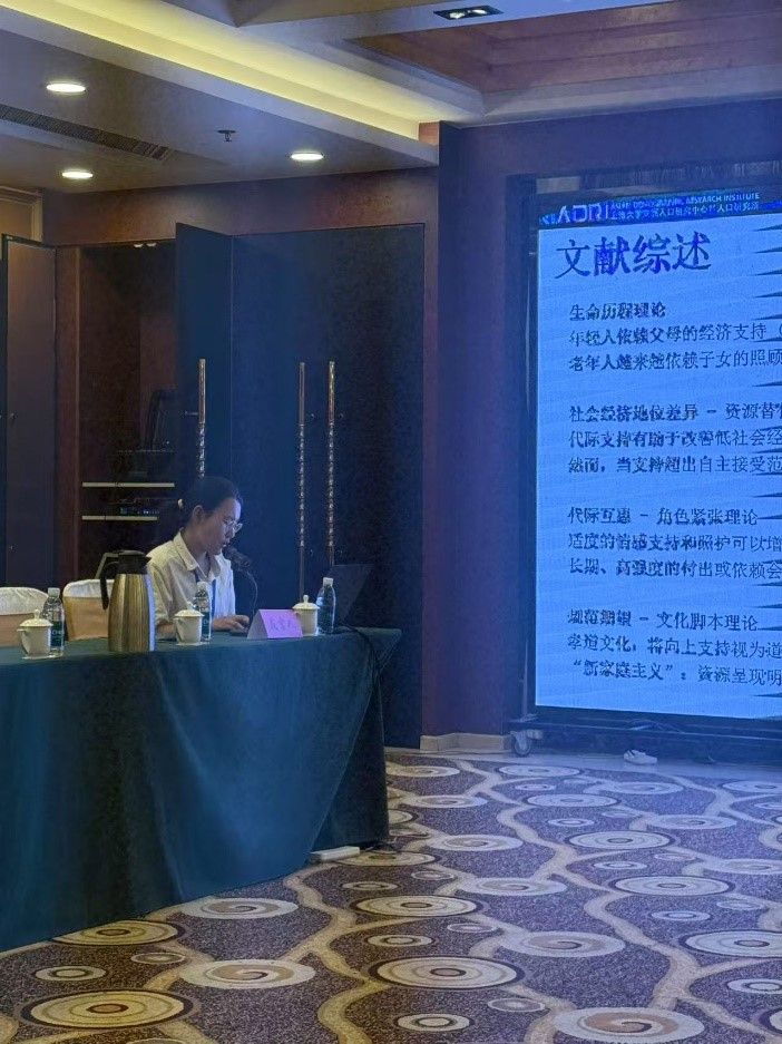 刘茜在作题为《社会经济地位与老年健康:代际支持的调节作用研究》的学术报告。刘茜同学的研究聚焦中国老龄化社会中的健康不平等问题,基于2020年中国健康与养老追踪调查数据,通过二元Logistic回归模型与交互效应分析,揭示了代际支持在社会经济地位与老年健康关系中的差异化作用。研究发现:子女经济支持对高教育水平老年人健康具有显著促进作用,但对低教育群体可能产生轻微负面效应,这一“资源强化”现象表明家庭支持并非天然的健康平等化工具;而情感支持则呈现跨教育水平的稳定积极作用。首都经济贸易大学的盛亦男教授指出,该研究为理解家庭支持与健康不平等的复杂关系提供了新证据,建议后续进一步纳入家庭关系与居住安排变量,以深化机制分析。通过参加本次论坛,刘茜同学在研究分析深度方面受到了很大的启发,她表示未来将结合专家建议,完善自己的研究成果,致力于推动更加公平、可持续的健康老龄化研究。