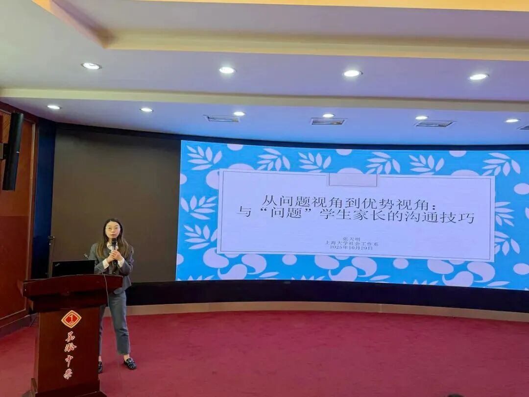 揭牌仪式后,学校社会工作站开展首次活动,由张天明老师带来专题讲座——《从问题视角到优势视角:与“问题”学生家长的沟通技巧》。