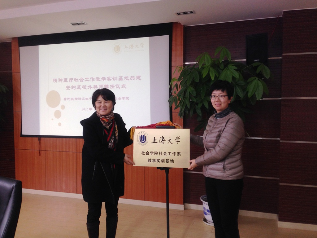 20151211日下午,普陀区精神卫生中心沈贞院长、周国权副院长一行受邀来到我院,在B417会议室参加了与600全讯白菜网社会工作系的教学实训基地揭牌、签约及校外导师聘任仪式。